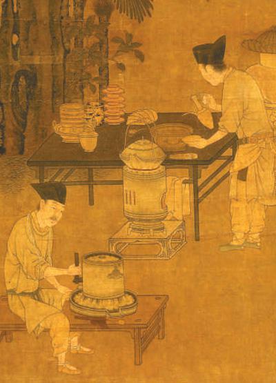 根據(jù)《茶錄》和《大觀茶論》復(fù)原的點茶程序,比制茶程序還多。首先對茶進行處理,要炙茶,即烤茶。然后是用砧椎椎茶,把茶放進木臼中初步搗碎。接著用茶碾碾茶,用石磨磨茶,進一步細(xì)化,接近面粉的細(xì)度。