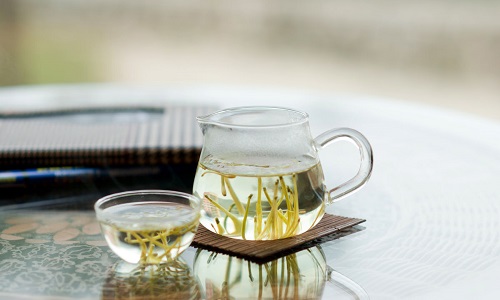 金銀花茶屬于花茶類,是用優(yōu)質(zhì)綠茶為素坯、加以新鮮金銀花,按金銀花茶窨制工藝窨制而成。夏季為金銀花的采摘期,花初開時為純白色,翌日變?yōu)辄S色,香氣逐漸散失,因此以開花當天采摘最好。