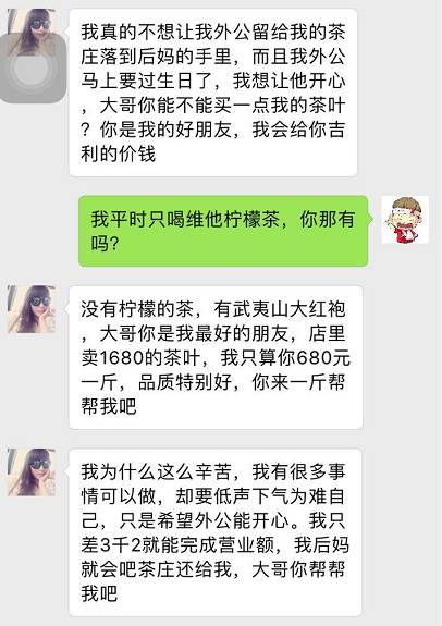 這個(gè)時(shí)候,騙子十有八九會(huì)出現(xiàn)跟你說(shuō)失戀的情況,哭的傷心欲絕,然后跟你傾訴,讓你憐香惜玉,之后會(huì)跑到武夷山爺爺奶奶或者外公外婆家中療傷,幫忙種茶炒茶,學(xué)會(huì)炒茶葉后決定自立自強(qiáng),開(kāi)創(chuàng)自己的事業(yè) —— 炒茶葉,賣茶葉。