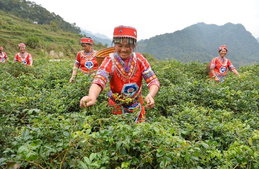 上午9時,7位身著土家族傳統(tǒng)服裝的婦女,有說有笑地在莓茶園里采摘莓茶。