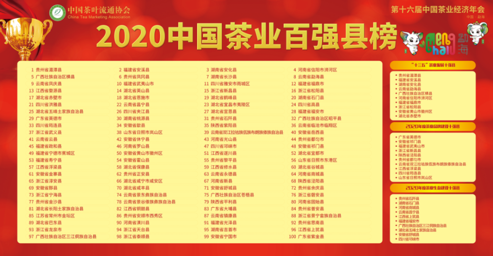 中國(guó)茶業(yè)經(jīng)濟(jì)年會(huì)是目前中國(guó)茶葉界歷史最久、規(guī)格最高、影響力最廣、創(chuàng)新力最強(qiáng)、凝聚力最大、業(yè)界主體參與最多、資訊發(fā)布最權(quán)威、傳播性最廣的年度經(jīng)濟(jì)盛會(huì)。此次入圍2020中國(guó)茶業(yè)百?gòu)?qiáng)縣榜單的地區(qū),廣東有3個(gè),分別是英德市和大埔縣,紫金縣是我市唯一上榜的地區(qū)。