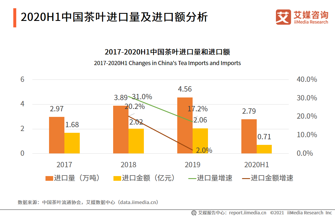 從進(jìn)口情況來看,2019年,中國(guó)茶葉進(jìn)口數(shù)量較上一年增長(zhǎng)17.2%至4.56萬噸;茶葉進(jìn)口金額較一年增加2.0%至2.06億元。2020年上半年,中國(guó)茶葉進(jìn)口量和進(jìn)口金額分別為2.79萬噸和0.71億元。