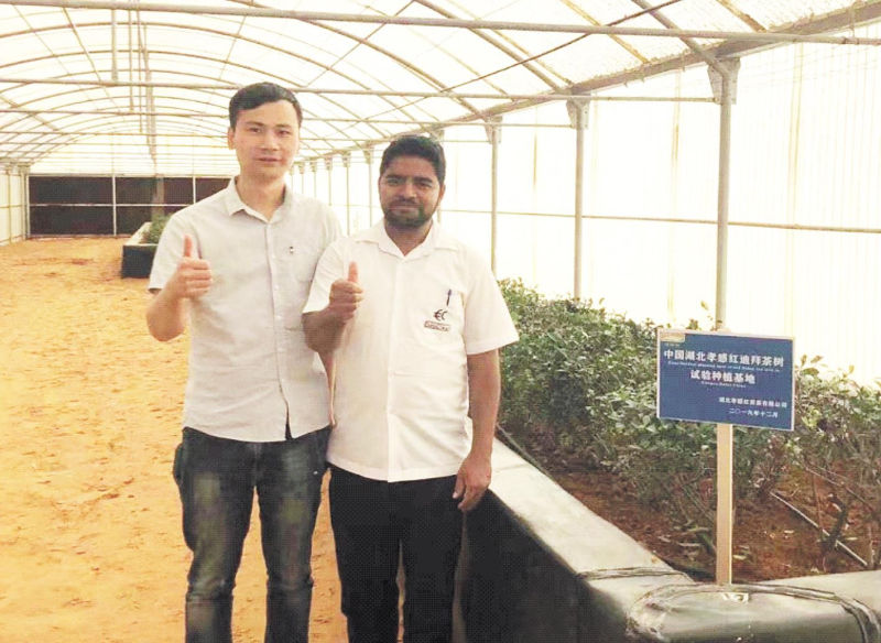 孝感種茶師晏立(左)與當(dāng)?shù)毓ぷ魅藛T在迪拜茶園。(受訪(fǎng)者供圖)