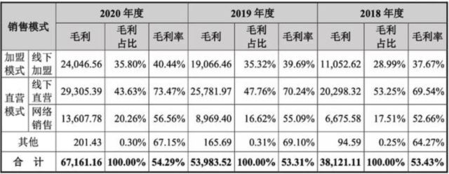 從銷(xiāo)售模式來(lái)看,八馬茶業(yè)采取的是“直營(yíng)+加盟”、“線上+線下”的全渠道銷(xiāo)售體系。截至2020年末,公司門(mén)店數(shù)量超過(guò)2000家,其中直營(yíng)店366家,加盟店超1700家。雖然,加盟店數(shù)量遠(yuǎn)超直營(yíng)店數(shù)量,但由于線下加盟模式的毛利率只有40%,遠(yuǎn)低于線下直營(yíng)模式73%的毛利率。因此,366家直營(yíng)店貢獻(xiàn)的毛利與超過(guò)1700家加盟店貢獻(xiàn)的利潤(rùn)大體相當(dāng)。