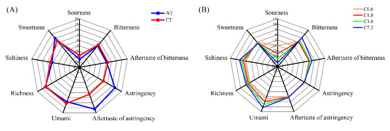 兒茶素,尤其是表沒食子兒茶素沒食子酸酯(EGCG)和表兒茶素沒食子酸酯(ECG)是茶葉苦澀味的最主要來源。秋茶經冠突散囊菌PW-1發(fā)酵后,兒茶素總量從118.35 mg/g下降到10.58 mg/g,下降幅度達 91.06%;且發(fā)酵秋茶中酯化兒茶素EGCG和ECG的含量分別為0.37 mg/g和0.40 mg/g,表明菌株PW-1發(fā)酵可顯著降低秋茶中的兒茶素含量。通過電子舌技術對秋茶和冠突散囊菌PW-1發(fā)酵秋茶的滋味特征進行分析,發(fā)現(xiàn)秋茶的澀味顯著降低而鮮味強度有所增加,表明秋茶經菌株PW-1發(fā)酵后的滋味品質得到顯著提高。此外,通過電子舌技術首次對茶褐素的滋味特征進行分析,發(fā)現(xiàn)茶褐素無澀味而呈強烈的鮮味,為發(fā)酵秋茶中的主要呈味物質。