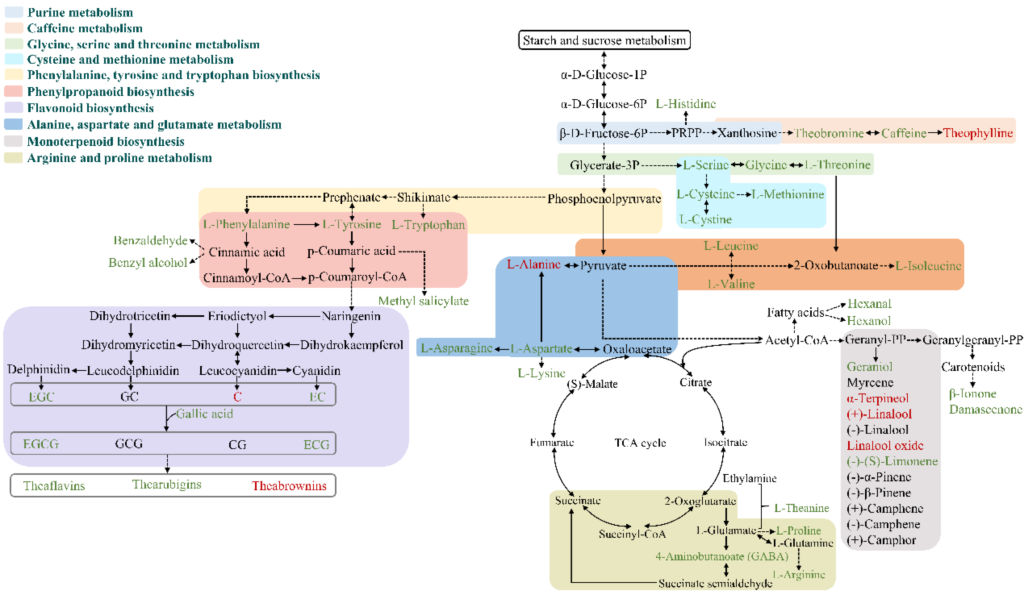 GC-MS分析結果顯示,秋茶中醇類揮發(fā)性成分的含量在冠突散囊菌PW-1發(fā)酵后顯著增加,其中呈花果香味的(Z)-芳樟醇氧化物、芳樟醇、(E)-芳樟醇氧化物(呋喃型)和 1-辛烯-3-醇的含量最高,表明菌株PW-1顯著提升了秋茶的香氣品質。代謝途徑分析結果顯示,冠突散囊菌PW-1提升秋茶品質主要與丙氨酸、天冬氨酸和谷氨酸代謝途徑,甘氨酸、絲氨酸和蘇氨酸代謝途徑,氨酰-tRNA 生物合成途徑,精氨酸生物合成途徑以及精氨酸和脯氨酸代謝途徑的表達相關。
