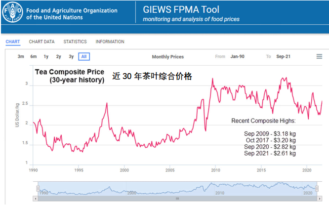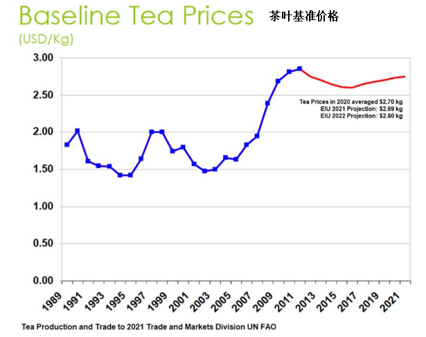 經(jīng)濟(jì)學(xué)人智庫(EIU)估計茶葉價格將上漲至接近長期平均水平,“我們預(yù)計,因為供不應(yīng)求,加上一些市場(特別是歐洲和北美)的茶葉需求逐漸復(fù)蘇,2021年剩余時間茶葉價格會穩(wěn)中有升。我們估計2021年全年平均價格為2.69美元/公斤,比 2020 年下降 0.5%。2022年茶葉均價將上漲 8.7%,至2.92 美元/公斤。”