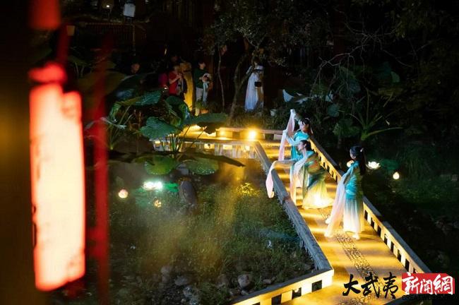 中秋之夜,月滿情濃。武夷山宋街景區(qū)內(nèi),流光溢彩,人流如織。吃茶、聽曲、猜燈謎......伴隨著古街內(nèi)的典雅的古琴聲“宋風(fēng)當(dāng)潮 · 武夷月夕”活動(dòng)擺茶開席,歌舞秀+民俗表演,將歷史上武夷山中秋夜民間祭月的場景予以復(fù)原,讓現(xiàn)場游人穿越時(shí)空,感受傳統(tǒng)中秋的賞月民俗。